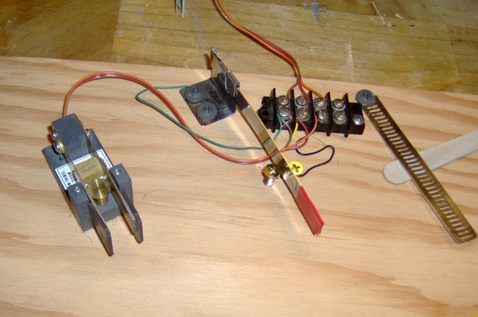 Here's my newest key (center). I cannibalized my old home-made straight key for the main piece of metal that I'd taken from a hunk of hose clamp. Than I hammered a mobile microphone clip into shape to clamp around the paddle itself, and mounted the entire thingy to the piece of 3/8 inch plywood. I also mounted my iambic paddle key to the same board (far left).